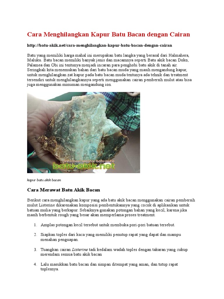 Cara menghilangkan kapur pada batu. Dengan menggunakan Listerine klik disini. Cara yang beredar di pasaran ternyata gak semuanya ampuh untuk menghilangkan kapur pada batu cincin milik anda. Rendam bacan di dalam air selama 2-3 hari pastikan air terserap didalam batu hal ini untuk mengeluarkan minyak cairan kimia lainnya karena ada kemungkinan pemegang batu bacan sblmnya pernah merendam batu tsb di minyak ato cairan kimia lainnya Rendam Batu Bacan.